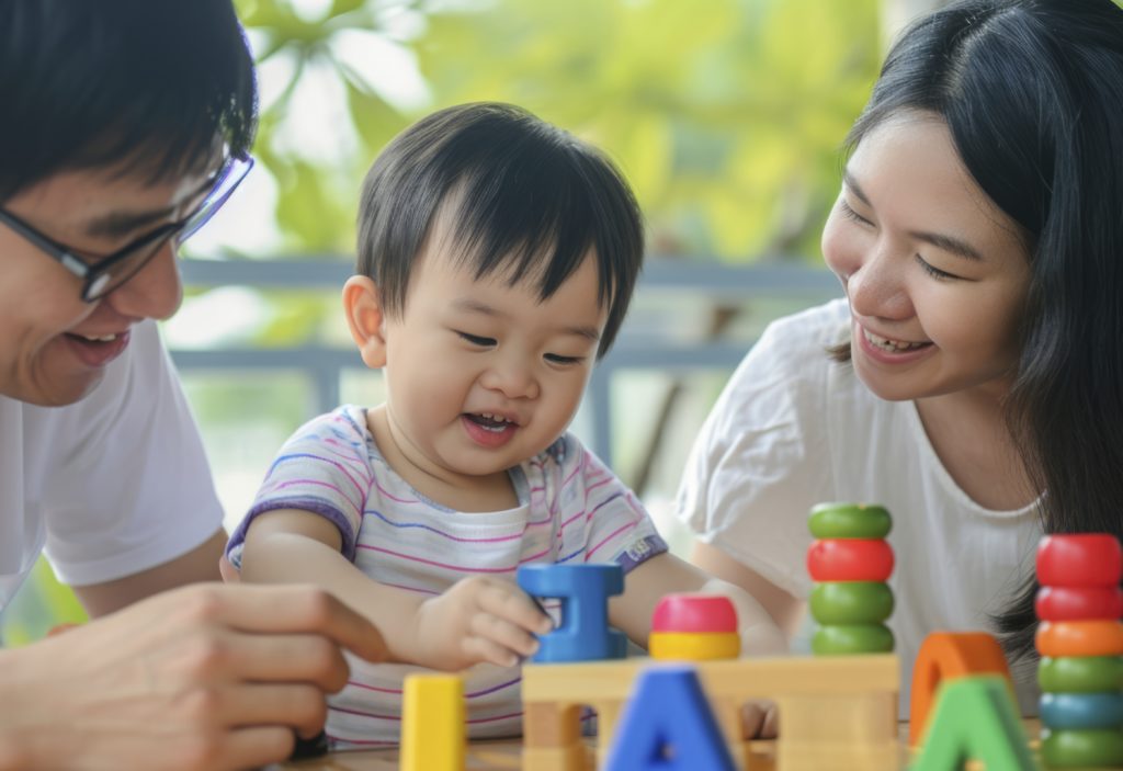 お次は、屋内でママ・パパと一緒におもちゃであそんでいる卓也くん。